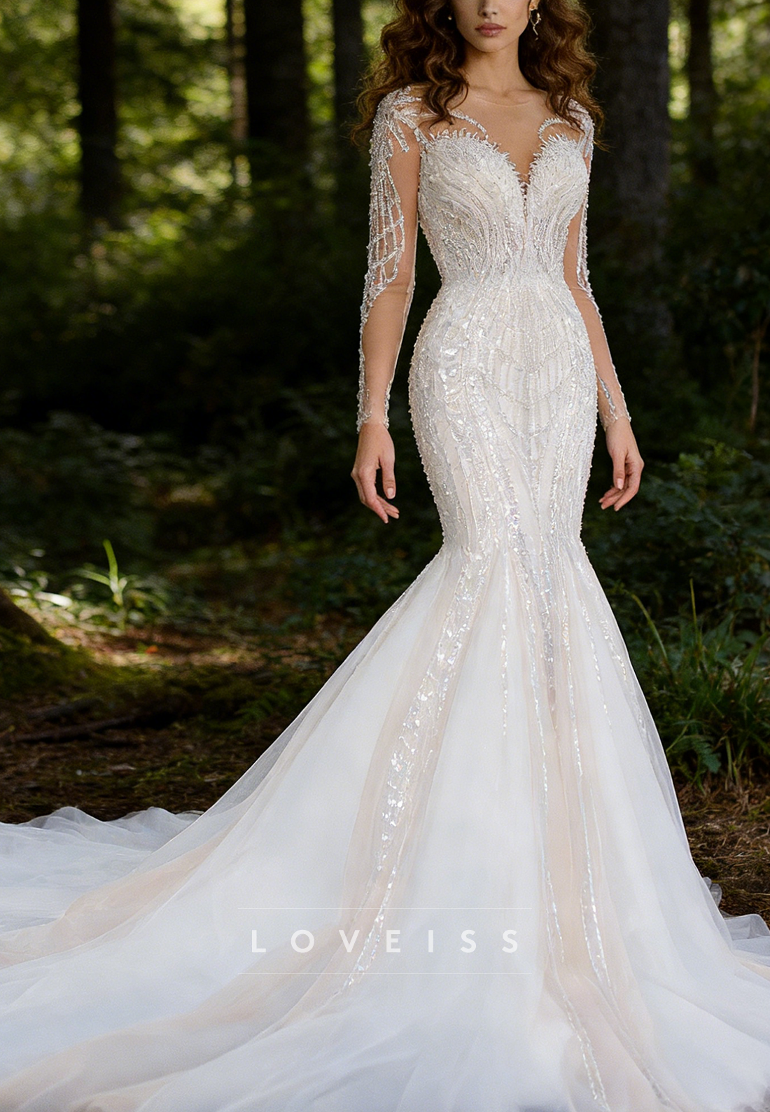 Radiate timeless elegance in this exquisite mermaid wedding dress, showcasing a delicate sweetheart neckline and flowing long sleeves adorned with intricate beaded embroidery. Each carefully placed bead catches the light, creating a luminous effect that draws the eye across the bodice and sleeves. The fitted silhouette gracefully transitions into a dramatic mermaid skirt, offering a flattering, show-stopping look. This masterfully designed gown combines traditional romance with refined sophistication, making it an ideal choice for the discerning bride who appreciates exceptional craftsmanship and timeless beauty.