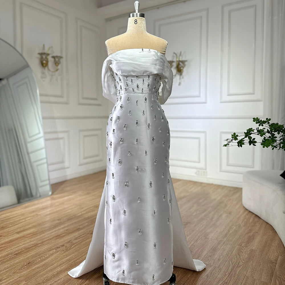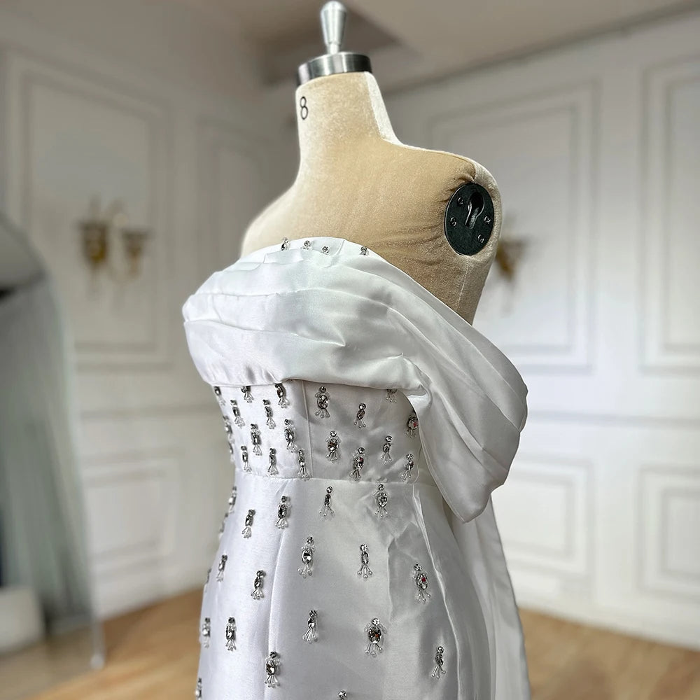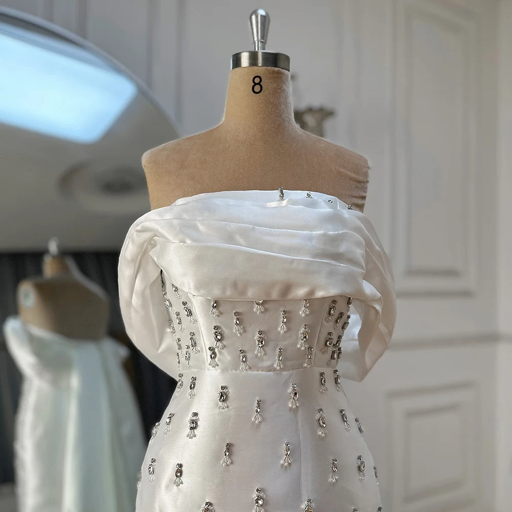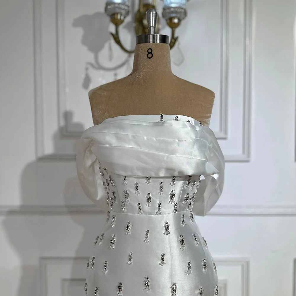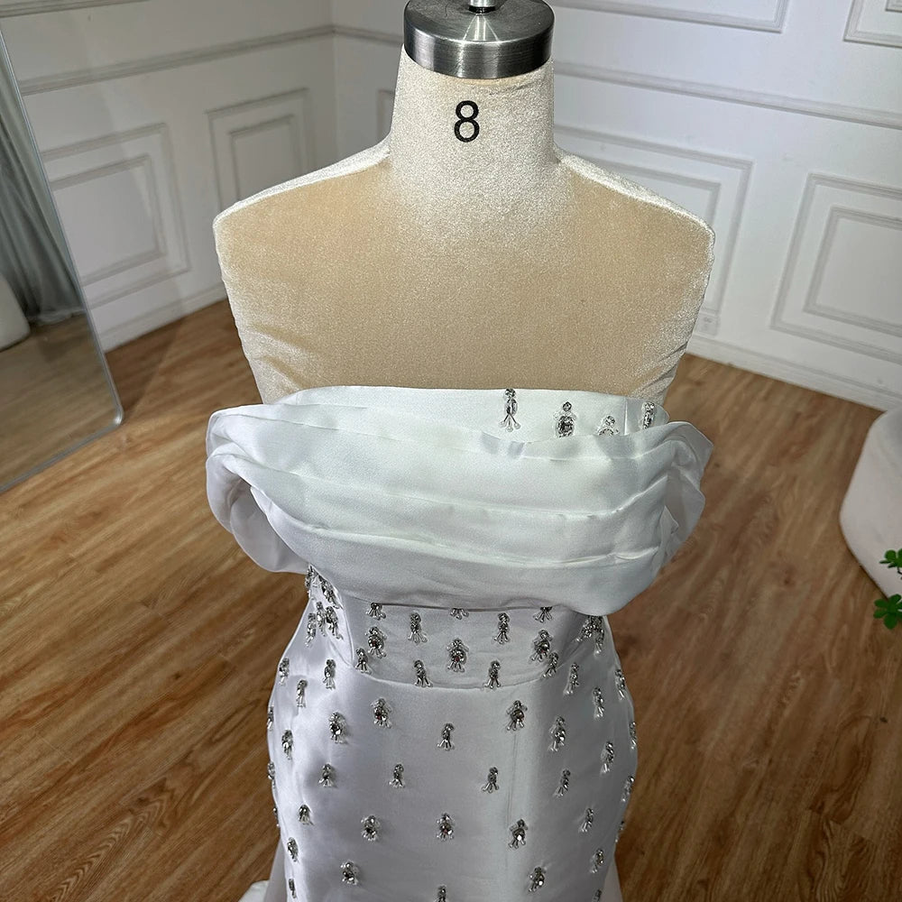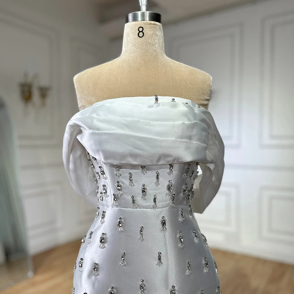 Blue Beaded Crystal Ankle-Length Mermaid Satin Evening Dress Gown for Party