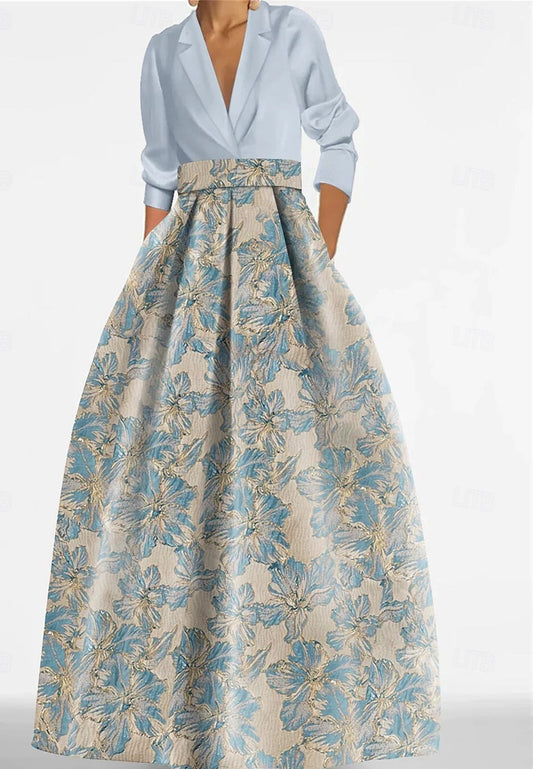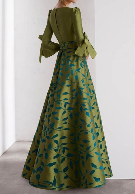 V-Neck Long Sleeves Sleek Floral Printed A-Line Mother of Bride Dress