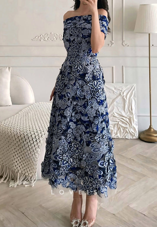 Off-Shoulder Cap Sleeves Floral Appliques A-Line Mother of Bride Dress
