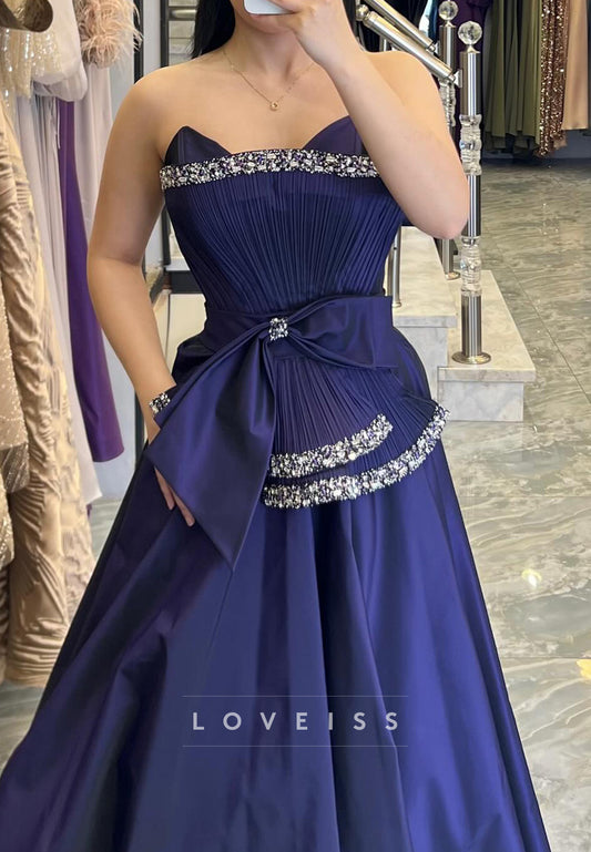 Off-Shoulder Sleeveless Beaded Pleated Satin A-Line Evening Dress