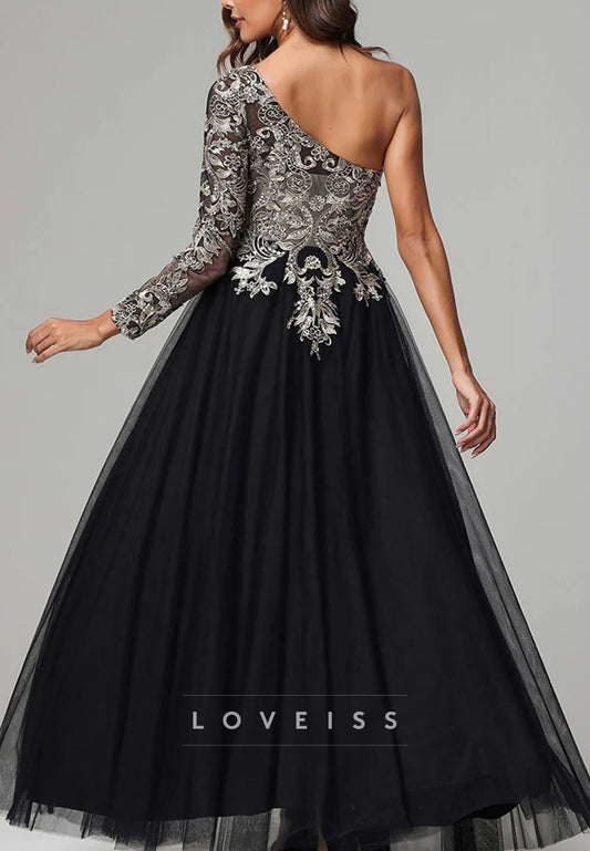 One Shoulder Long Sleeves Appliques A-Line Mother of Bride Dress