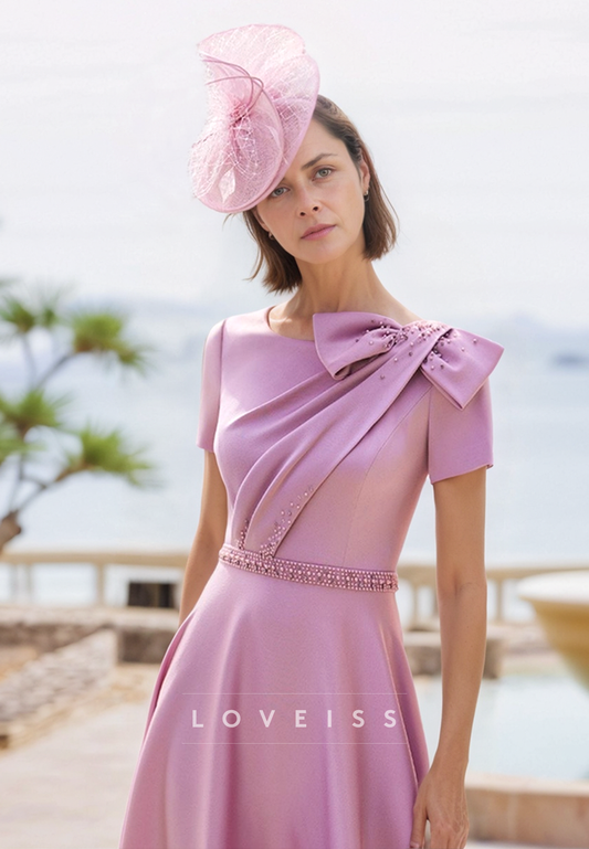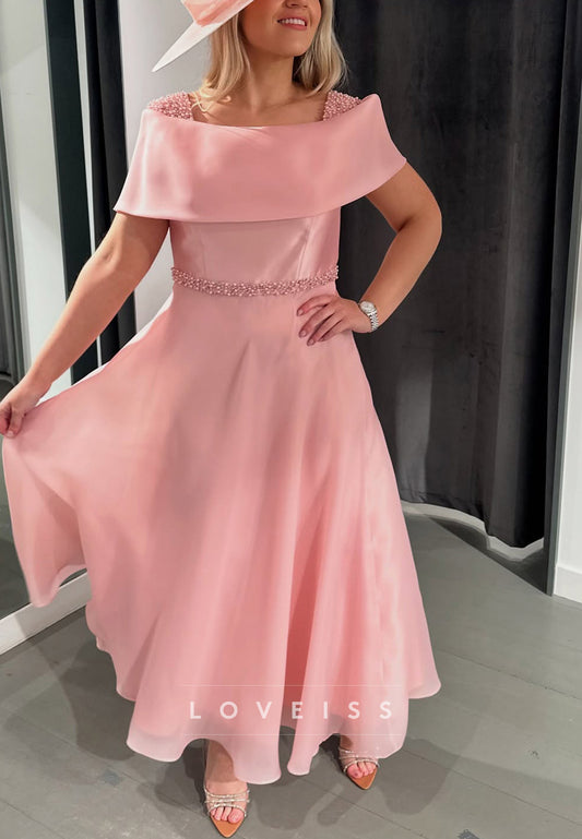 Square Beaded Short Sleeves A-Line Mother of Bride Dress