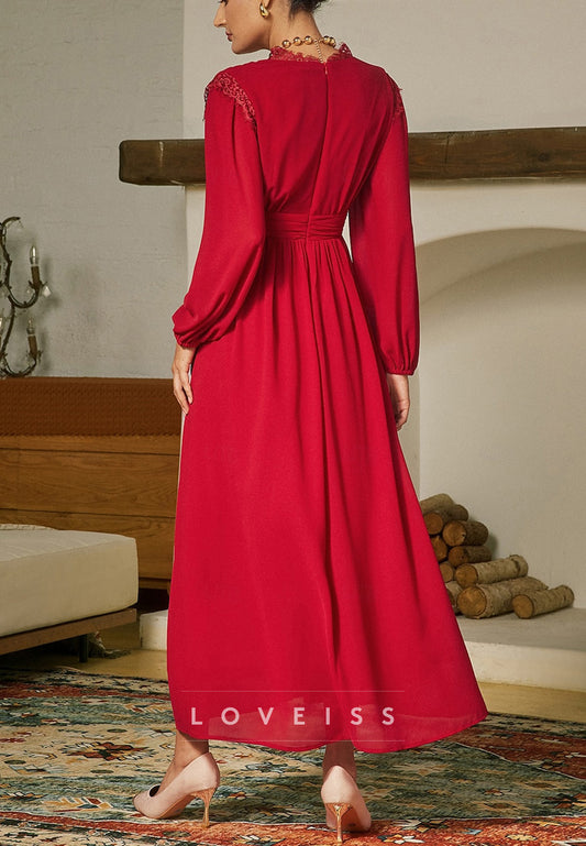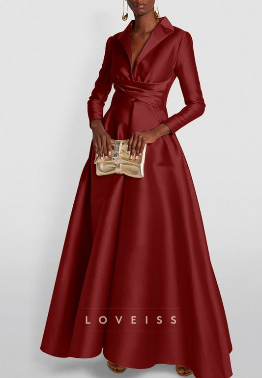 V-Neck Long Sleeves Pleated A-Line Mother of Bride Dress