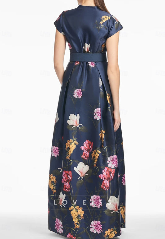 V-Neck Cap Sleeves Floral Printed A-Line Mother of Bride Dress