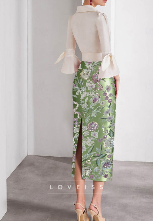 V-Neck Floral Appliques Long Sleeves Sheath Mother of Bride Dress