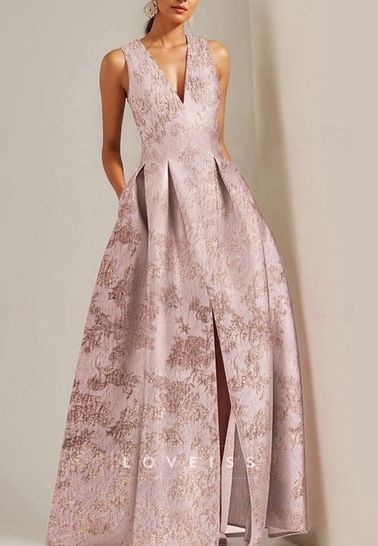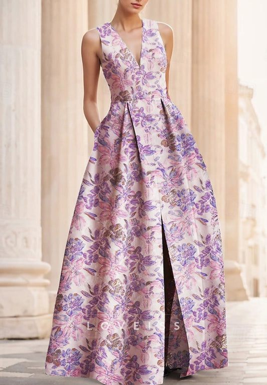 V-Neck Sleeveless Floral Printed A-Line Mother of Bride Dress