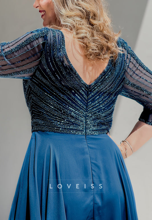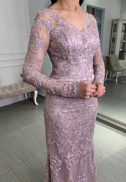 V-Neck Long Sleeves Sleek Side Slit Mermaid Mother of Bride Dress