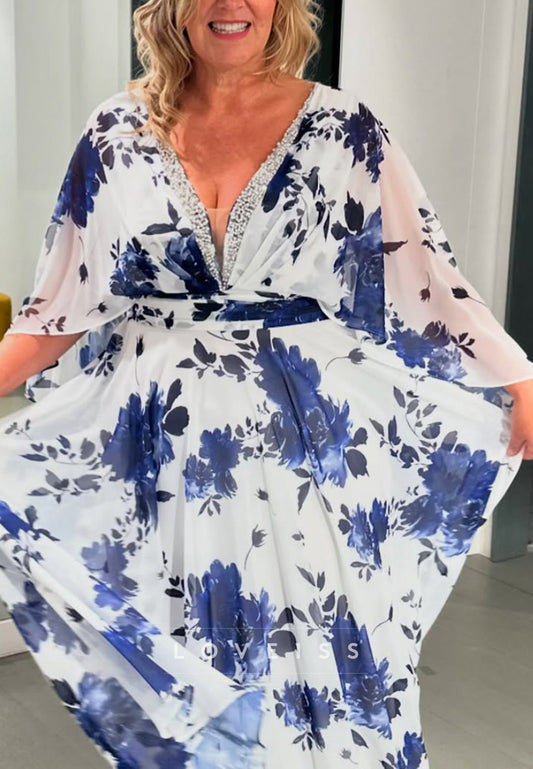 V-Neck Short Sleeves Floral Printed Chiffon A-Line Mother oif Bride Dress