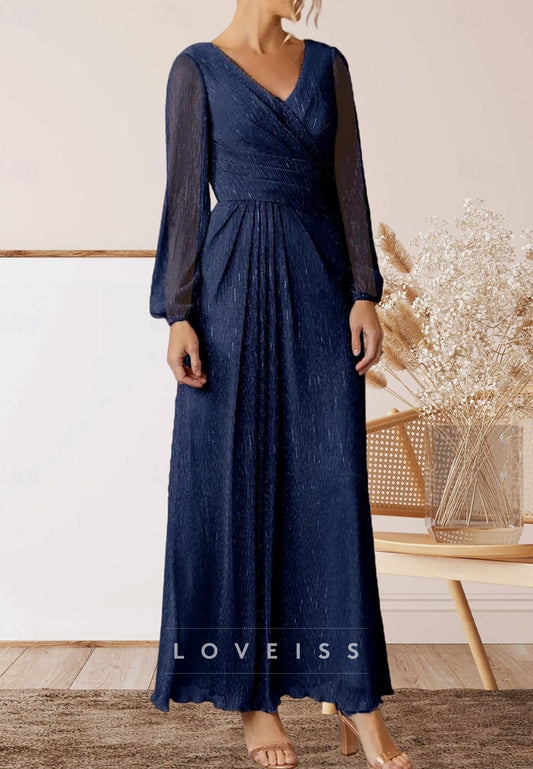 V-Neck Long Sleeves Sparkly Pleated A-Line Mother of Bride Dress