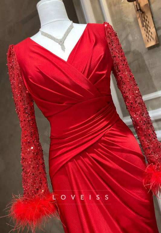 V-Neck Long Sleeves Feathered Sheath Formal Dress