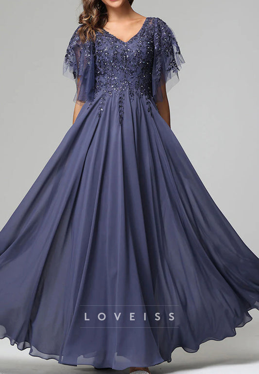 V-Neck Short Sleeves Appliques Chiffon A-Line Mother of Bride Dress