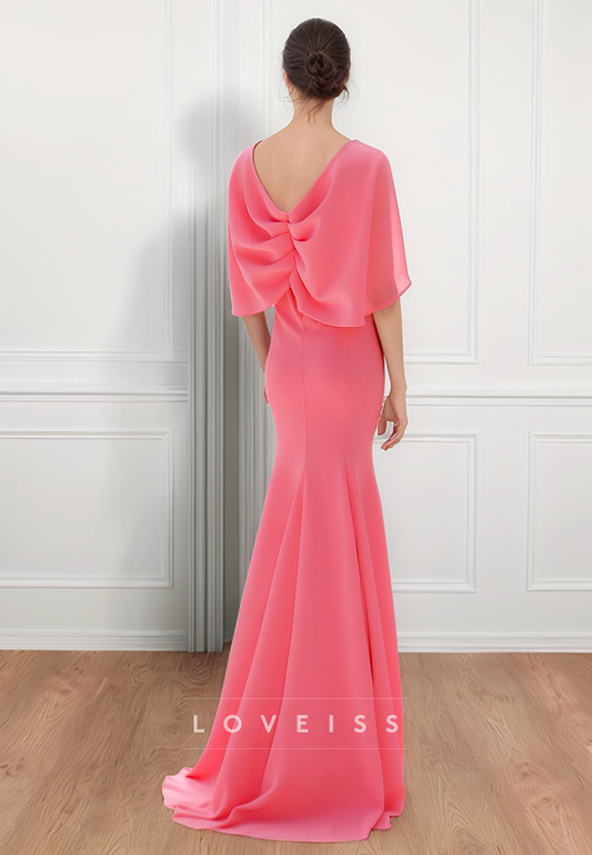 V-Neck Short Sleeves Pleated Sleek Mermaid Mother of Bride Dress