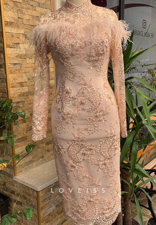 High Neck Long Sleeves Lace Appliques Feathered Sheath Mother of Bride Dress