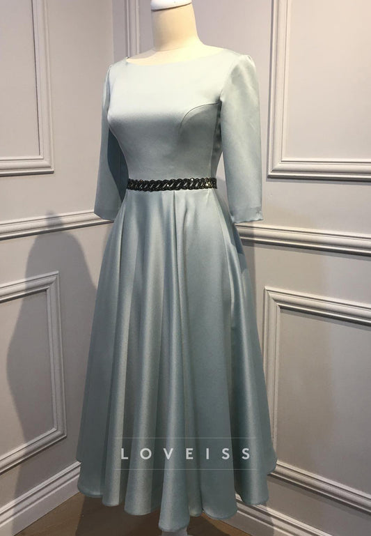 Square Puff Sleeves Belt Sheath Fitted Mother of Bride Dress