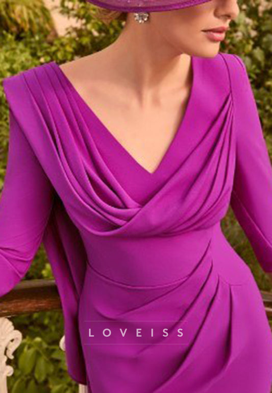 V-Neck Long Sleeves Pleated Sheath Mother of Bride Dress