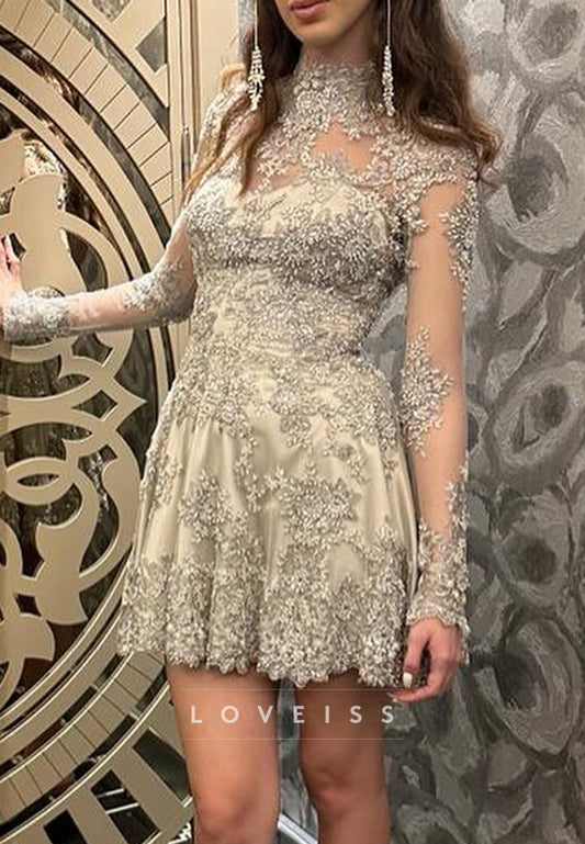High Neck Long Sleeves Appliques A-Line Party Homecoming Dress