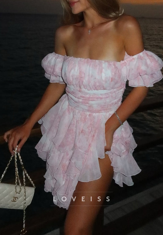 Off-Shoulder Puff Sleeves Tiered Floral Printed A-Line Party Homecoming Dress
