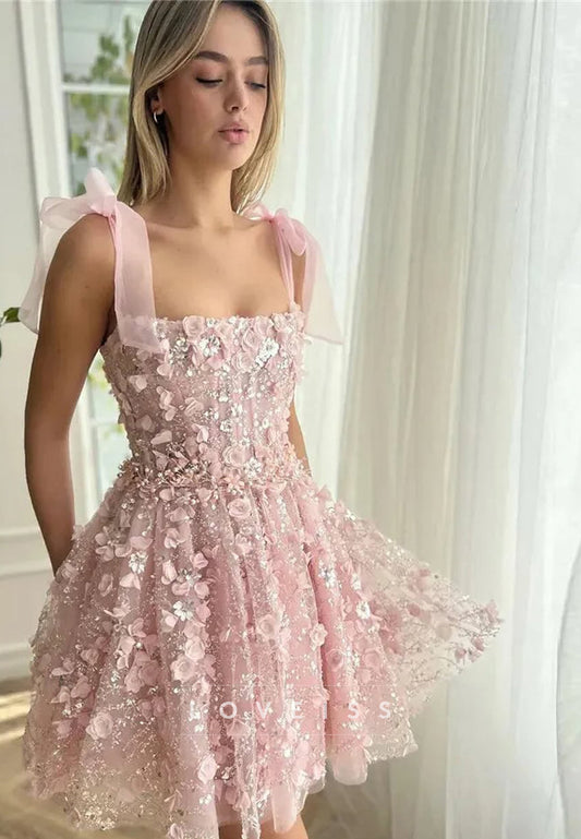 Square Spaghetti Straps 3D Floral A-Line Party Homeecoming Dress