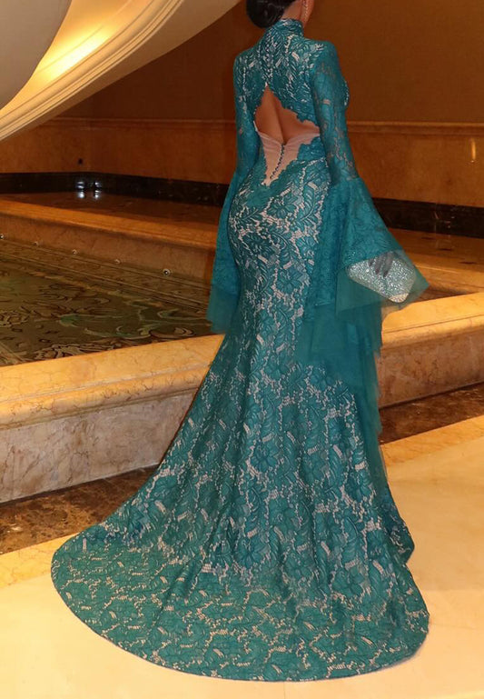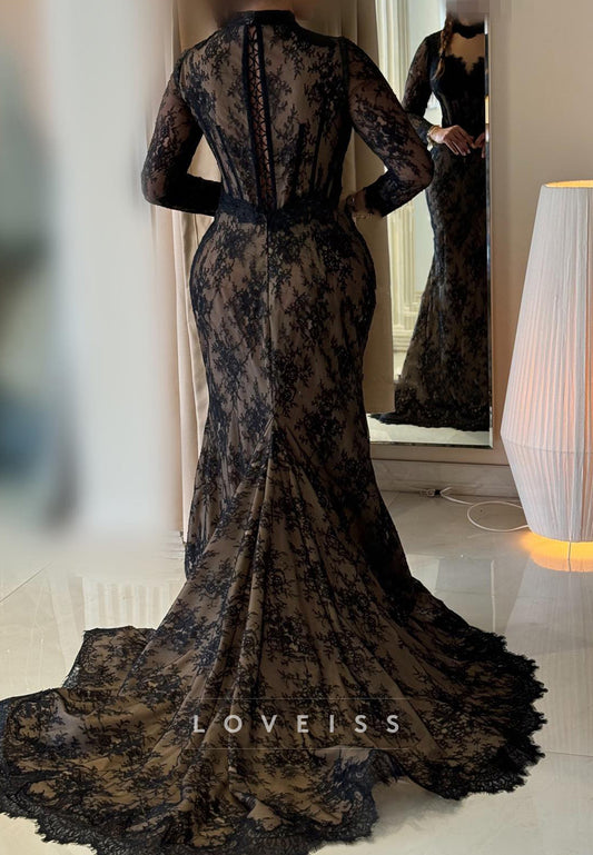 High Neck Long Sleeves Lace Appliques Mermaid Evening Dress