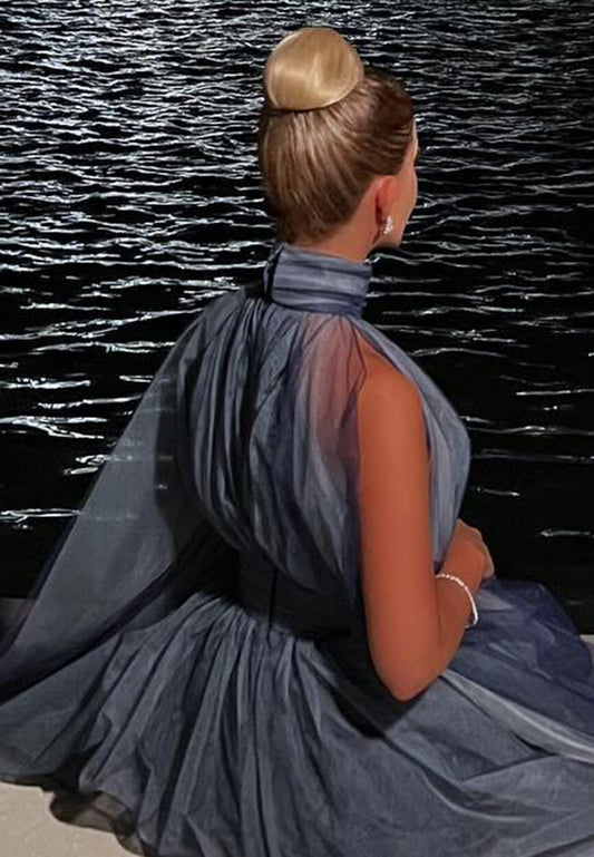 High Neck Sleeveless Pleated Mesh A-Line Evening Dress