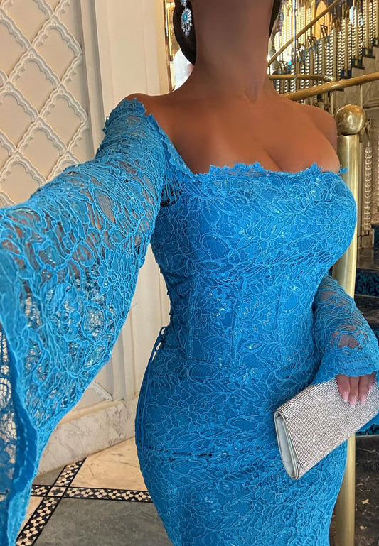 Off-Shoulder Long Sleeves Lace Appliques Mermaid Evening Dress