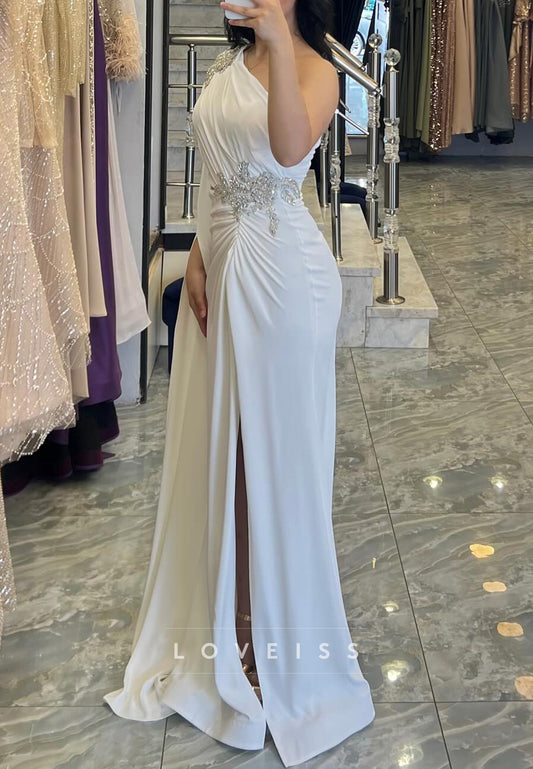 One Shoulder Pleated Side Slit Beaded Sheath Formal Dress