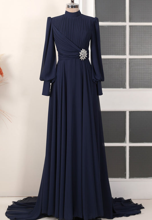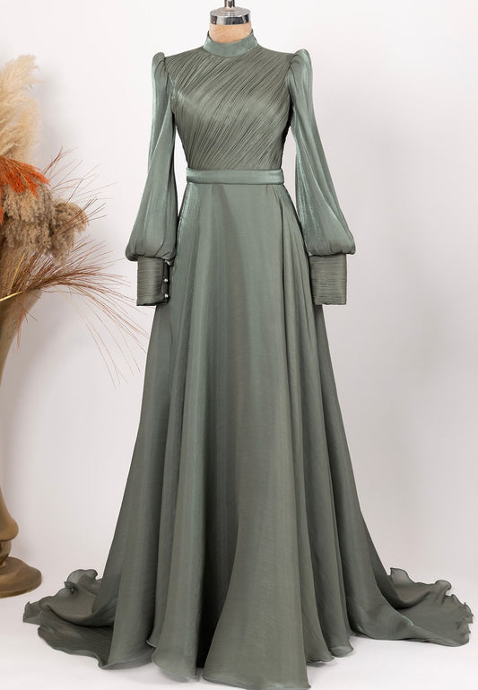 High Neck Long Sleeves Pleated Sleek A-Line Mother of Bride Dress