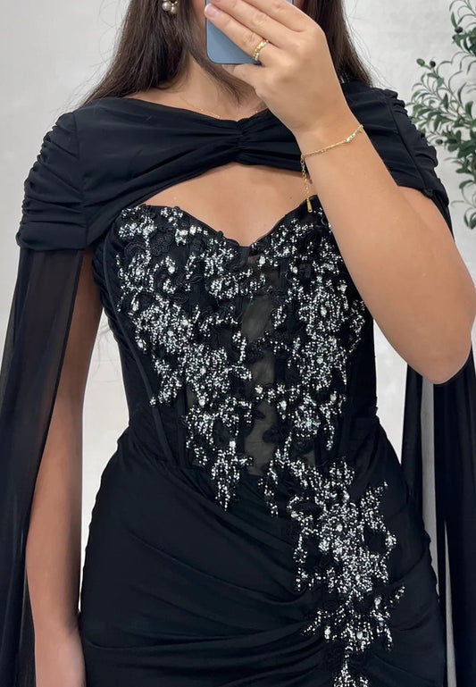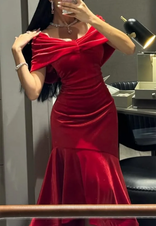 Off-Shoulder Cap Sleeves Velvet Ruffled Mermaid Evening Dress