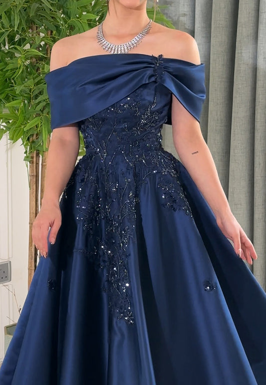 Off-Shoulder Sleeveless Beaded Pleated Satin A-Line Evening Dress