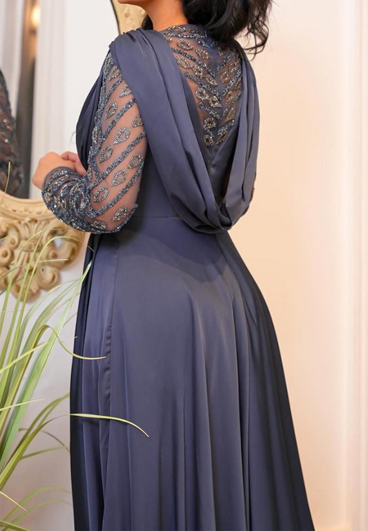 Scoop Long Sleeves Beaded Side Slit Pleated Formal Dress