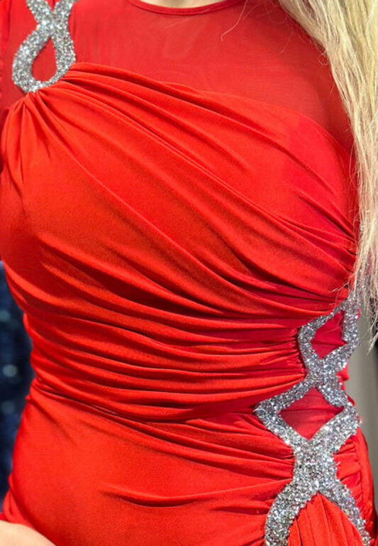 Asymmetrical Long Sleeves Pleated Beading Sheath Evening Dress