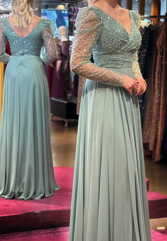 V-Neck Long Sleeves Sparkly Pleated Chiffon A-Line Mother of Bride Dress