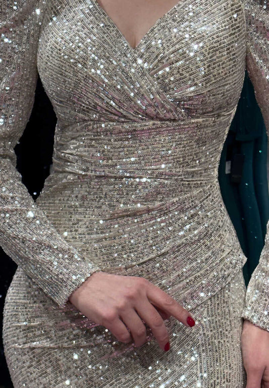 V-Neck Long Sleeves Sparkly Side Slit Mermaid Evening Dress