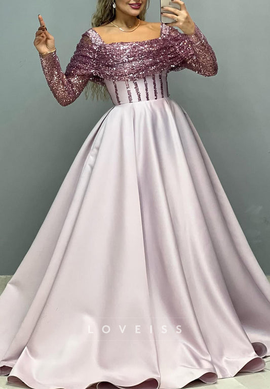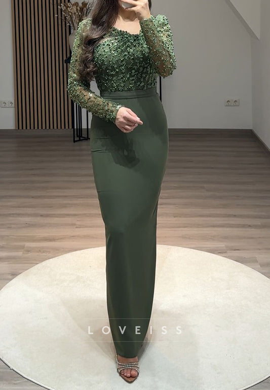 Sheath Square Long Sleeves Baeded Mermaid Formal Evening Dress Floor Length