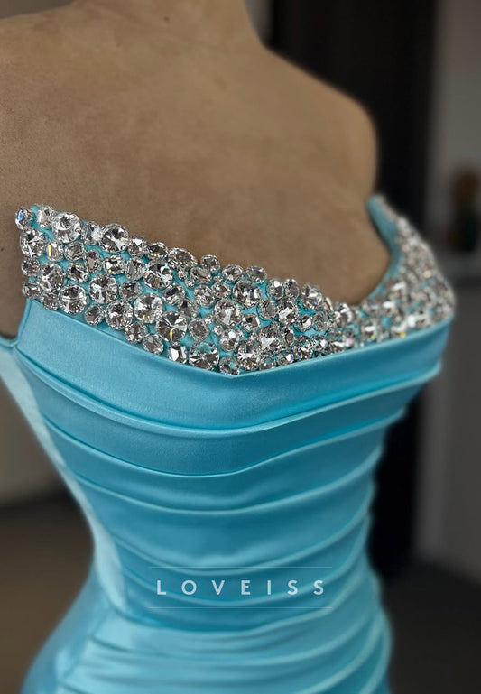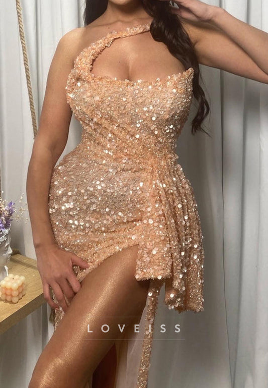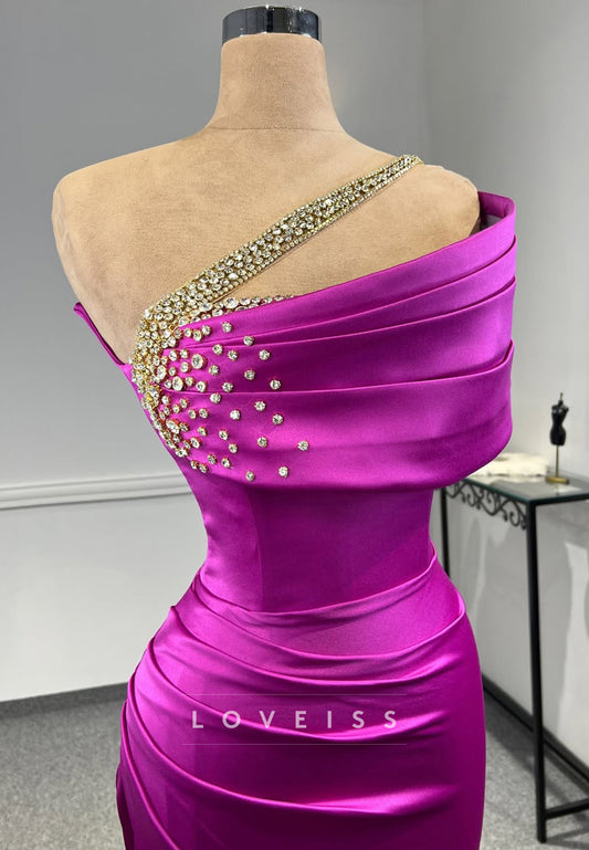 One Shoulder Pleated Beaded Side Slit Sheath Prom Dress