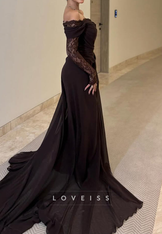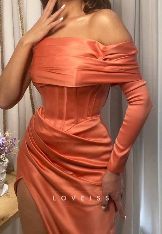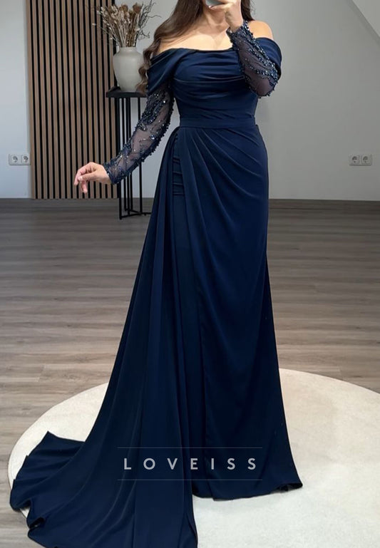 Off-Shoulder Long Sleeves Ruched Pleated Sheath Prom Dress