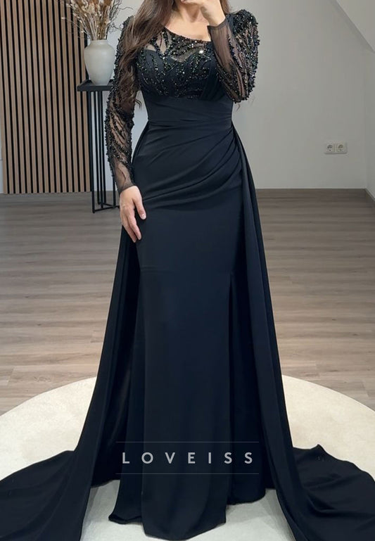 Scoop Long Sleeves Beaded Mermaid Wedding Guest Sparkly Formal Dress