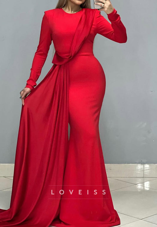 Scoop Long Sleeves Pleated Mermaid Formal Dress