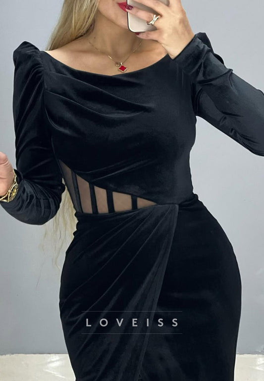Scoop Long Sleeves Velvet Ruched Formal Dress
