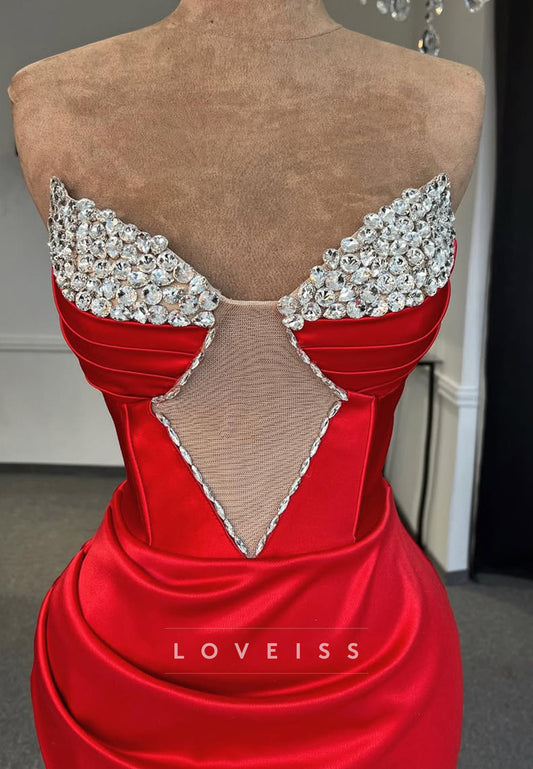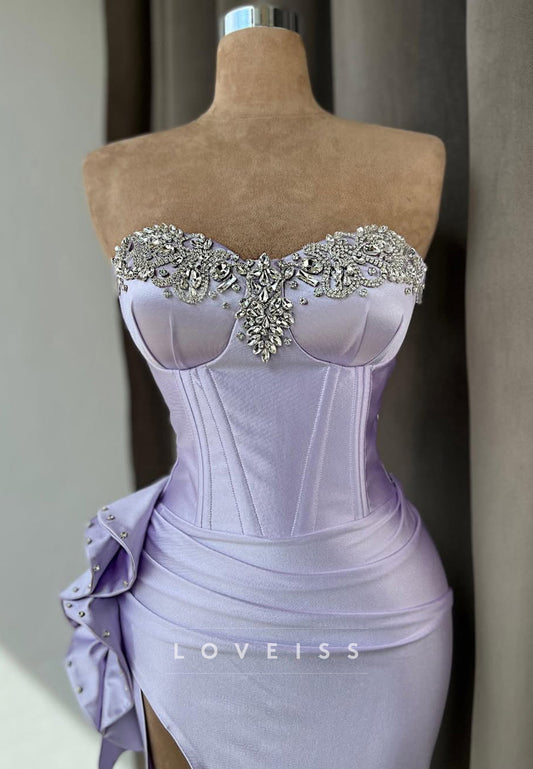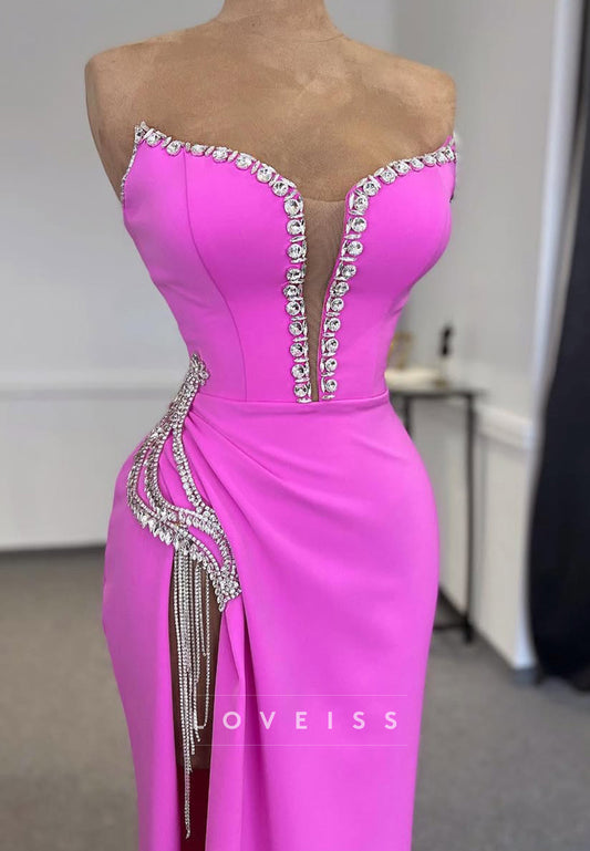 V-Neck Strapless Beaded Pleated Side Slit Evening Dress