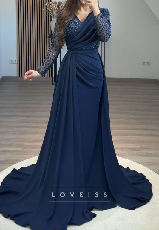 V-Neck Long Sleeves Beaded Pleated Sheath Formal Dress