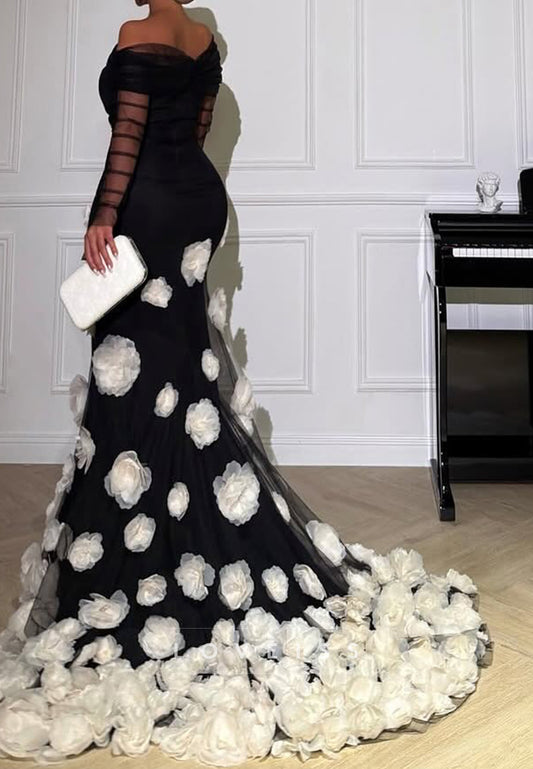 Asymmetrical Long Sleeves Floral Embellished Mermaid Evening Dress