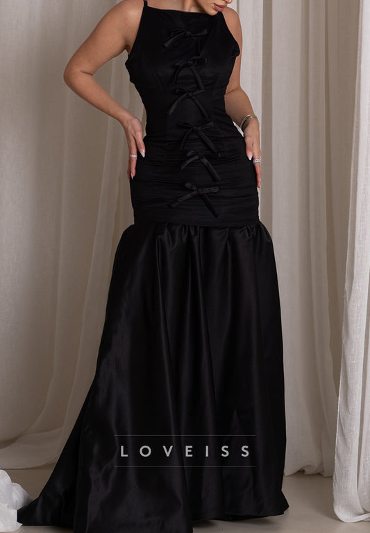 Bateau Sleeveless Bow Pleated Fitted A-Line Evening Dress