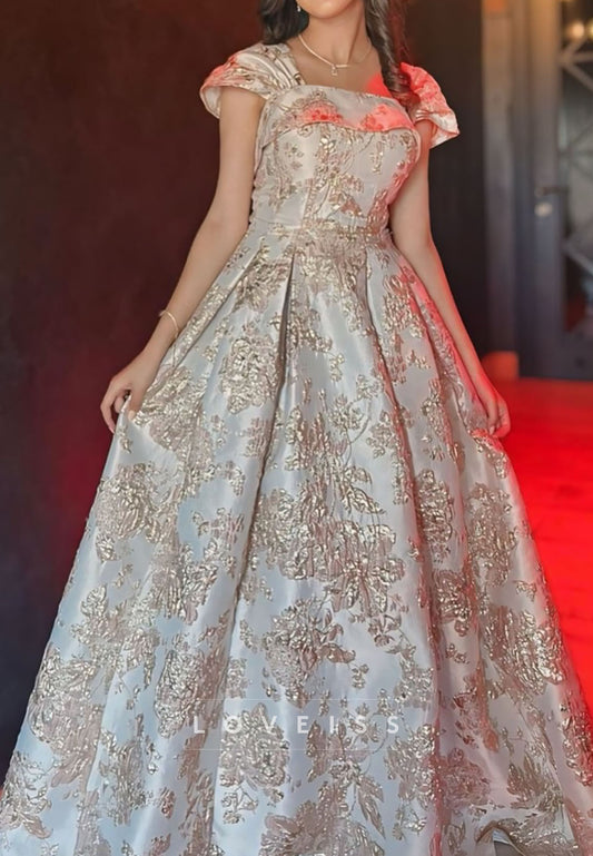 Square Cap Sleeves Floral Printed A-Line Evening Dress