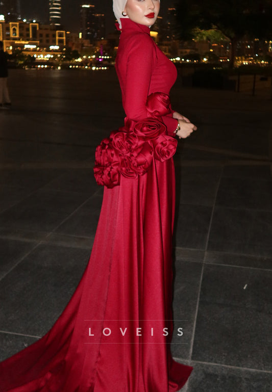 High Neck Long Sleeves 3D Floral Mermaid Evening Dress