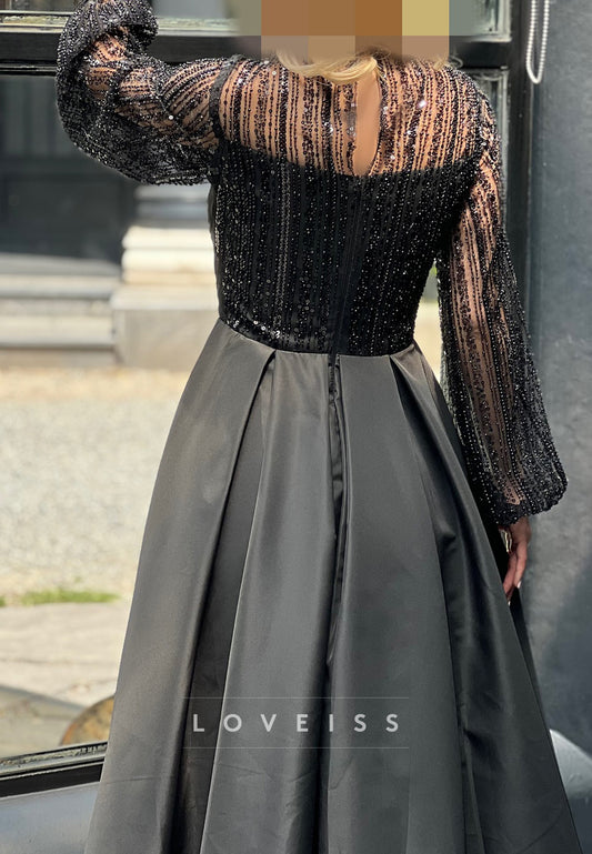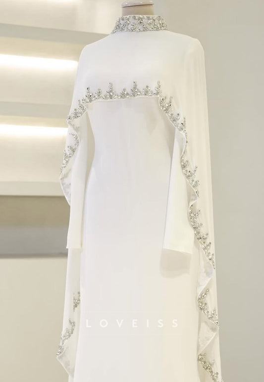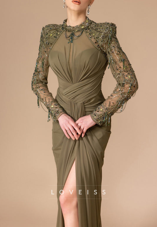 High Neck Long Sleeves Beaded Sheath Evening Dress