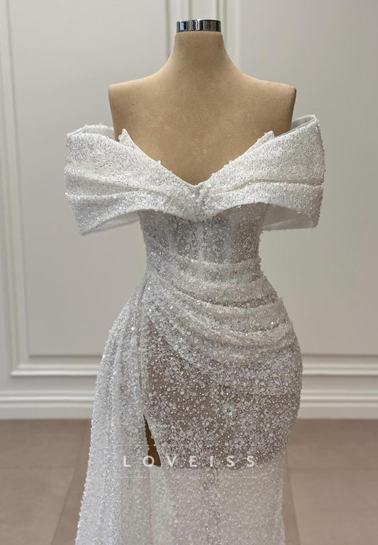 Off-Shoulder Beaded Embroidery Pleated Sheath Wedding Dress