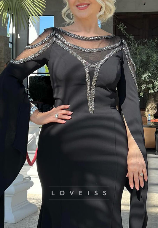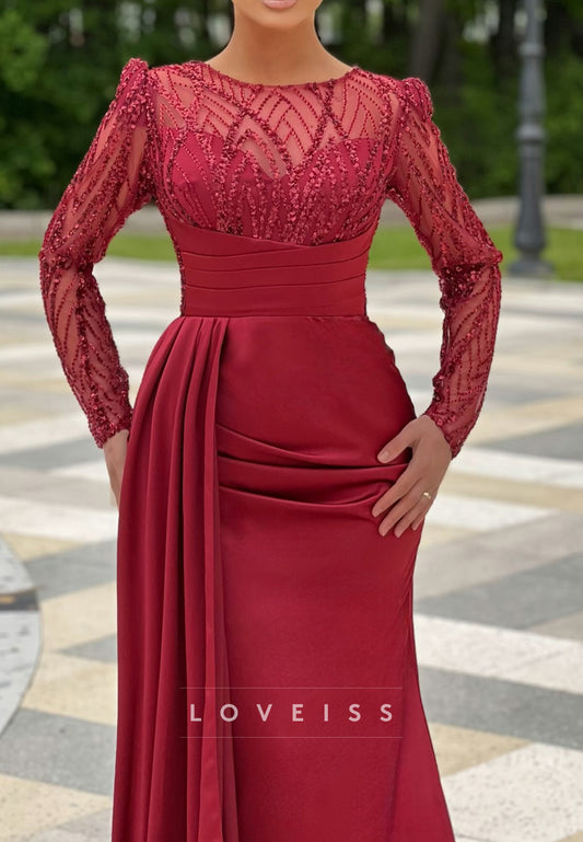 Asymmetrical Long Sleeves Beaded Mermaid Evening Dress