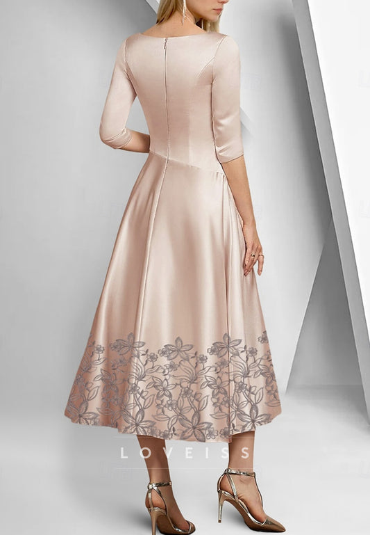 V-Neck Long Sleeves Appliques A-Line Midi Mother of Bride Dress